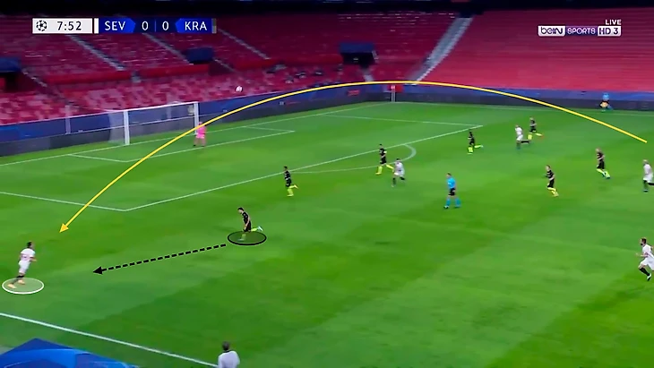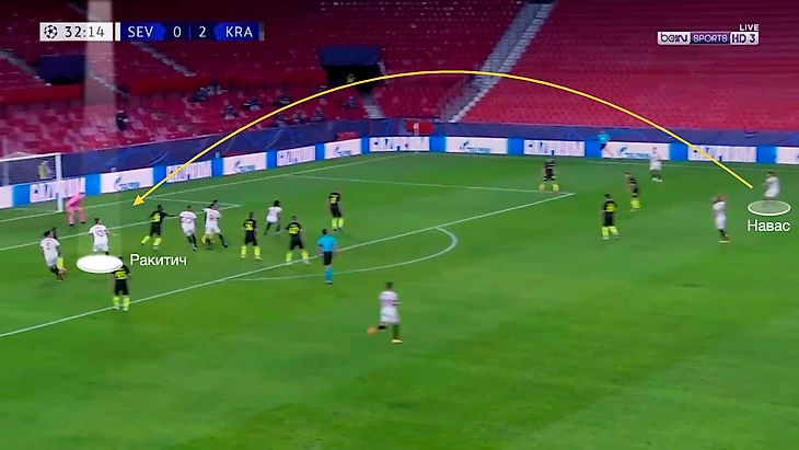 «Севилья», пожалуй, одна из лучших команд в Европе по качеству переключения флангов. Кроссы с фланга на фланг резкие, быстрые и удивительно точные из раза в раз. Никаких пуляний по аутам, минимум «холостых» рывков под приём. Такие кроссы доставляет буквально эстетическое удовольствие. Но самое главное, крайним игрокам соперника, которые пытаются сохранять компактный блок, приходится преодолевать огромные расстояния на скоростных рывках: