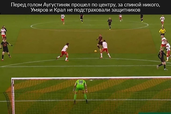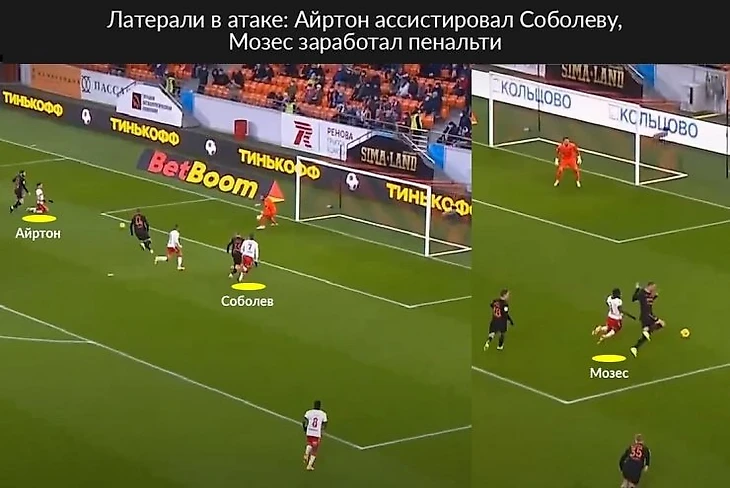 Фишка этой идеи в том, что когда «Спартак» переводит значительные силы на правый фланг – слева можно заметить, как Крал делает шаги влево, прикрывая спину Айртону. Зобнин еще активнее и очевиднее страхует Мозеса после его атак. Сегодня Тедеско получил плоды от такой тактики, ведь у бразильца голевая передача, у нигерийца – заработанный пенальти.