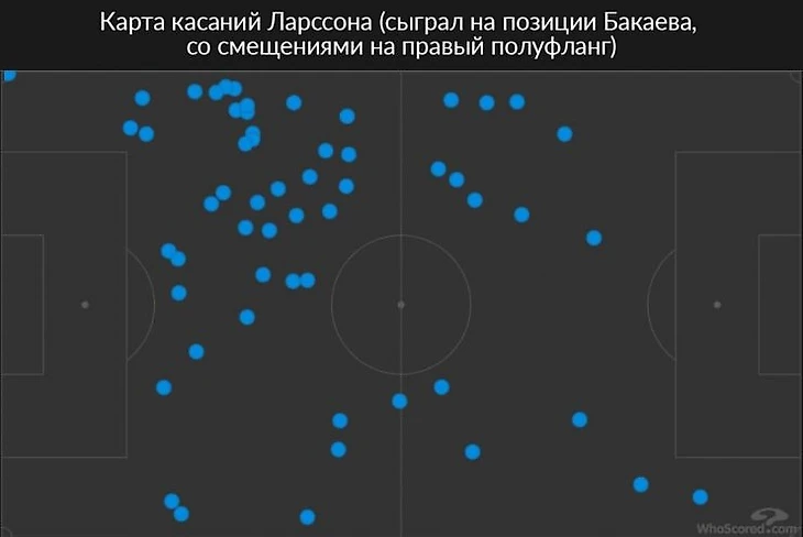 Зелимхан, хотя его по праву критиковали – не в форме, провел в основе 10 туров. Теперь уже из четырнадцати, ведь Ларссон сыграл сегодня плеймейкера. Для Джордана, что не пропустил ни одного поединка, позиция не новая, но Тедеско выпустил одновременно и шведа, и Соболева с Понсе. Смелая схема с тремя номинальными форвардами позволила собрать удары – 17 штук на выезде. Ларссон создал четыре из них, причем переключился строго на пасы, обошелся без единого удара.