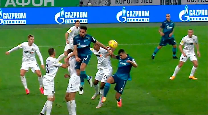 Через 20 минут нечто похожее возникло у ворот «Краснодара»: сначала казалось, что Кайо локтем вмазал Ловрену в глаз, но по укрупнению и стоп-кадрам ВАР-повтора можно сделать вывод, что суть все-таки в игре рукой. Бразильский защитник выставил крыло слишком далеко: смотрели долго, но назначили.