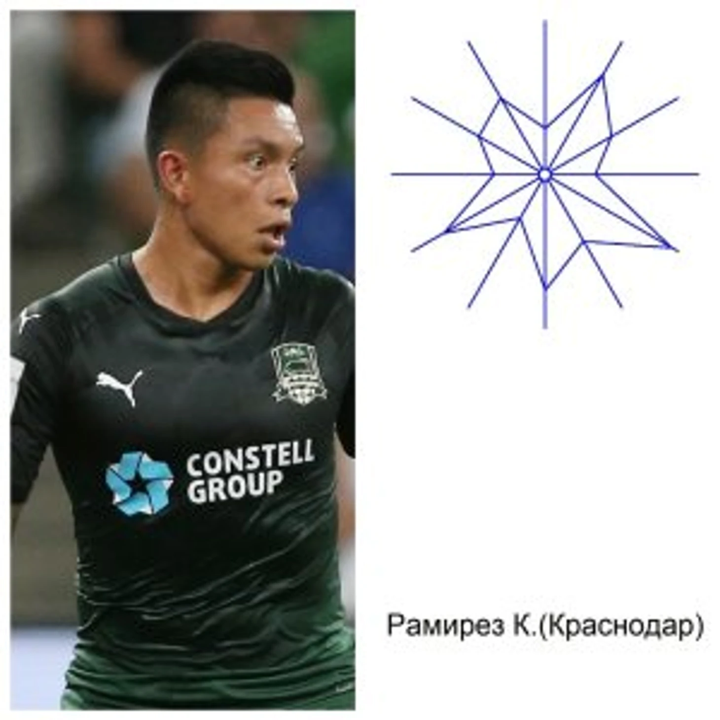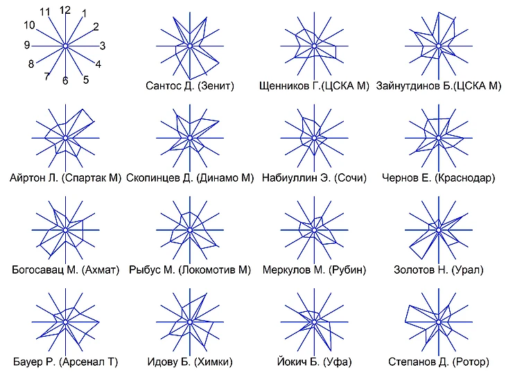 Наилучшие показатели игры в пас, ключевые пасы и ассисты (лучи 4, 5, 6) у Д.Сантоса, который лидирует в этом рейтинге с большим отрывом, вторым по этому показателю является К. Рамирез из Краснодара. Наиболее низкие значения этих комбинационных показателей отмечены у Е.Чернова и Д.Степанова.