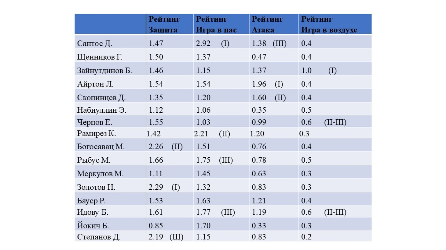 Если суммировать все показатели, то наибольшую пользу своим командам приносят бразильцы Д.Сантос и Л.Айртон, на третьем и четвертом местах К.Рамирез и Б.Зайнутдинов. Российские игроки в этом сезоне пока показывают средние суммарные рейтинги: Д.Скопинцев – 8-й, Е. Чернов – 10-й, но их можно рекомендовать в сборную России. Отметим и молодого Д.Степанова (Ротор), который демонстрирует активную игру, на нем часто фолят, и он сам фолит, много играя как в обороне, так и поддерживая атаку.