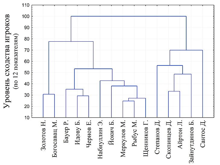 Отдельно рассмотрим игровые профили левых защитников РПЛ с помощью диаграмм кластерного анализа. Наиболее яркими представителями ориентированных на оборону левых защитников являются Н.Золотов и М.Богосавац, к этому типу уделяющих основное внимание оборонительной игре можно также отнести опытных Б.Идову, Е.Чернова и Р.Бауера.