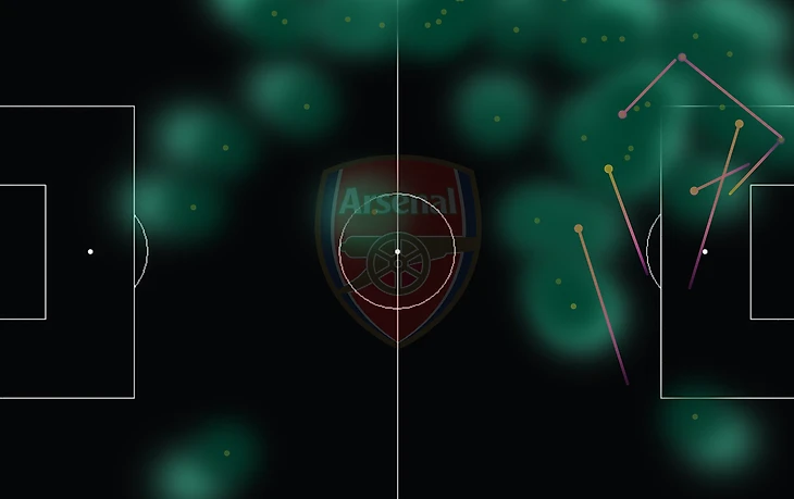 Обамеянг же и виновник, и заложник этой ситуации. На представленном выше графике его левый фланг самый неактивный, в этом нет конечно же и половины его вины (ожидаемые голевые передачи подтвердят), но зона пустует и вероятно какие-то требования Артеты не выполняются, либо Артета сам ошибается с настройками. Ну а в штрафной быть активным в такой ситуации очень сложно, тем более, когда на тебе и большая часть созидательной работы.