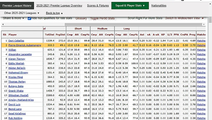 Он выполнил 11 из 50 суммарных передач под удар в этом сезоне «Арсенала». То есть пятая часть всех кейпасов на нем, а потом различные ресурсы ужасаются его низкой ударной статистике. Все эти «аналитики» серьезно думают, что можно подавать себе мячи и забивать одновременно? Стоит только посмотреть ниже на таблицу от fbref.com чтобы понять насколько Обамеянг вовлечен в созидательную работу «Арсенала» и насколько ужасны в целом командные показатели.