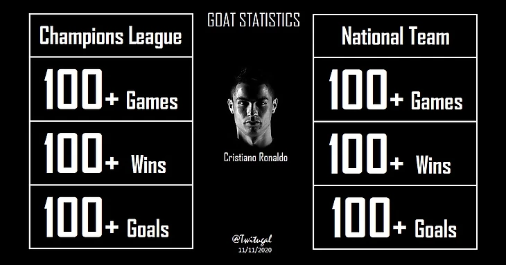Криштиану Роналду – первый в истории игрок, сыгравший 100+ матчей, достигший 100+ побед и забивший 100+ голов в Лиге чемпионов и за национальную сборную.