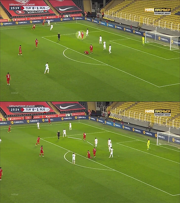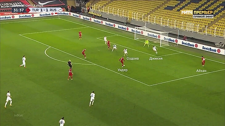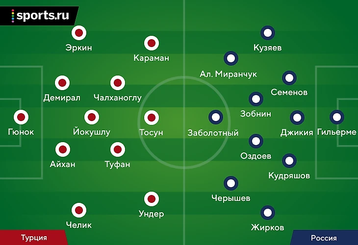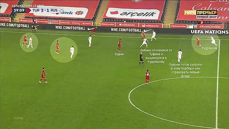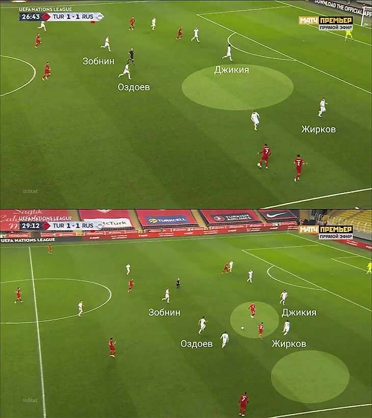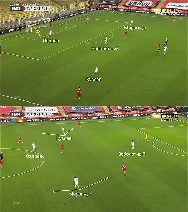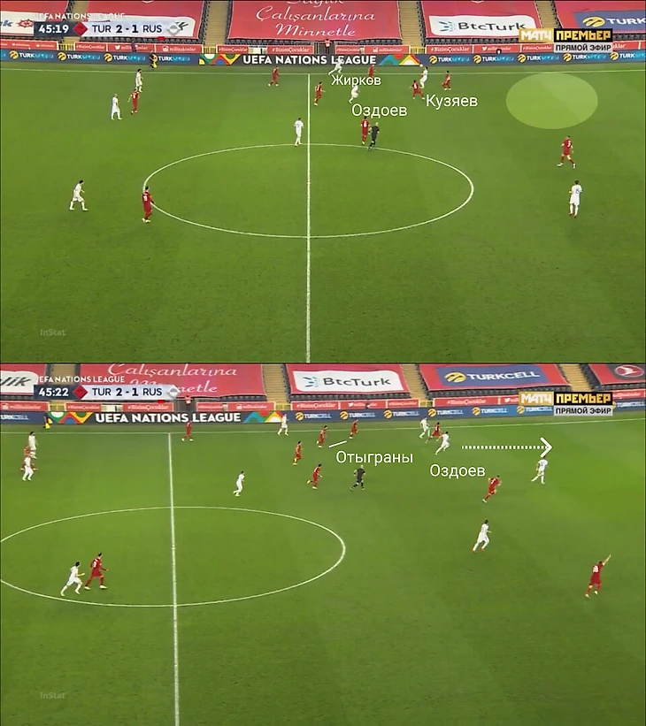 Момент Оздоева в начале второго тайма – идеальный пример, как Россия собиралась взламывать Турцию. Два фланговых игра двигались навстречу. Цель Кузяева – освободить зону для включения Жиркову и Оздоеву. По ходу матча несколько подобных комбинаций были доведены до ума.