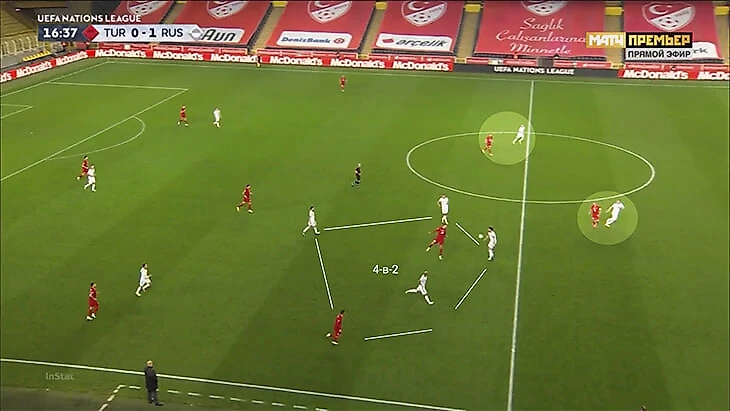 За счет перегруза флангов Россия контролировала включения вингеров сборной Турции. Плюс защитники часто получали дополнительную подстраховку, так как турки не поспевали за нашим движением.