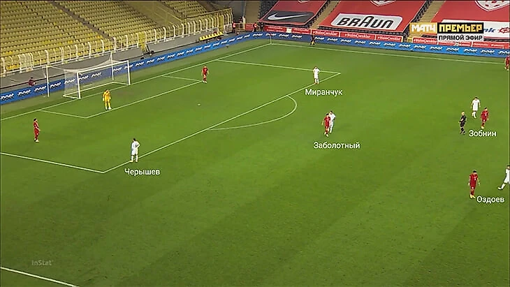В позиционной атаке в меньшинстве была важна роль Зобнина. Он неоднократно создавал тройку вместе с Кудряшовым и Джикией, чтобы перевести мяч на фланг. Дополнительный элемент неожиданности – рывки Караваева по центру.