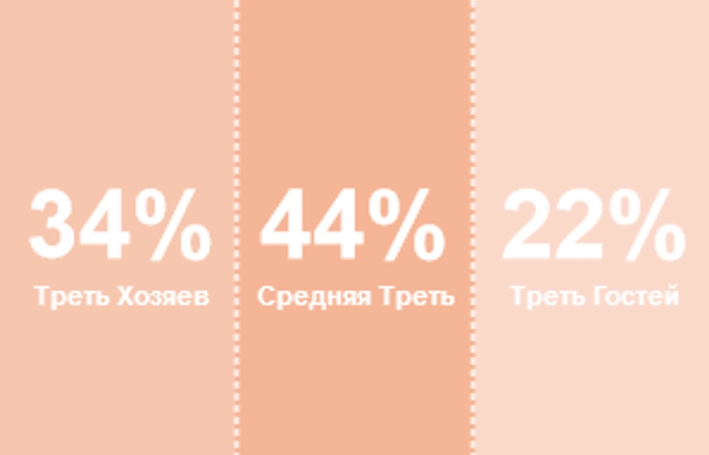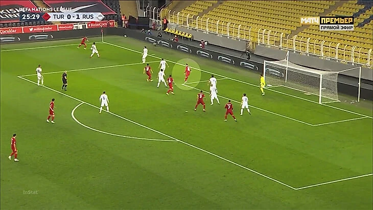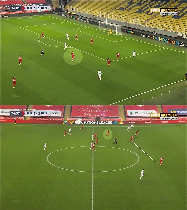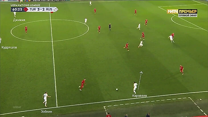 Проблемы со строительством атак у Турции возникали, даже когда Россия откатывалась назад. В такие моменты Россия выстраивалась по 4-4-1: Заболотный выгонял мяч на фланг, тогда в прессинг включался Миранчук/Кузяев и поджимал кто-то из пары Оздоев-Зобнин. Жирков и Караваев шикарно играли по вингерам, а центральные полузащитники полностью растворились, поэтому турки запускали бесконечные лонгболлы. Статистика подтверждает успех прессинг-плана: на трети поля сборной России прошло всего 22% действий с мячом.