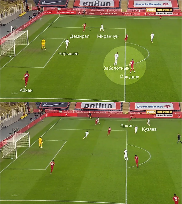 Кузяев и Миранчук находились в полупространстве между центральными и крайними защитниками сборной Турции, а Заболотный чаще играл по мячу.