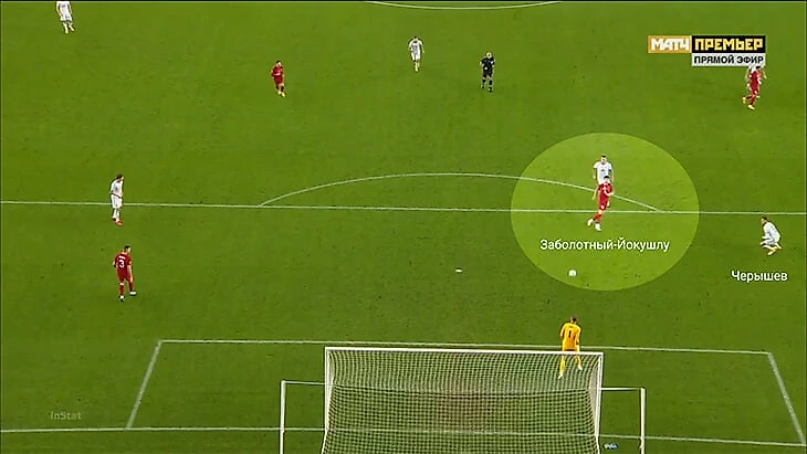 4. Главный элемент плана Черчесова – агрессивный персональный прессинг. Черышев и Алексей Миранчук играли по центральным защитникам – Айхану и Демиралу, Заболотный оттягивался в опорную зону к Йокушлу, Оздоев и Зобнин давили на центральную ось, а крайних защитников накрывали Жирков и Кузяев.