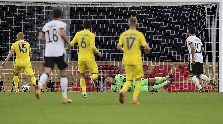 Мы увидели привычные 4-3-3 от Шевченко. В начале атаки гости стремились разыгрывать от вратаря через пас - огромная ответственность ложилась на Зинченко и Малиновского. Они в своих полуфлангах искали свободное пространство и продвигали мяч на чужую половину через пас или на рывках. Сделать это было крайне сложно - немецкий прессинг работал слаженно. Хозяева плотно перекрывали центр - атакующая тройка разбирала персонально центральных защитников и опорника, поэтому восьмёркам украинской сборной приходилось опускаться ниже на фланги для взаимодействия с крайним защитником. Возникали большие трудности, так как несколько раз за тайм Германия отбирала мяч на половине гостей. Но если им удавалось пройти их давление, то получалось благодаря фланговым розыгрышам и неплохому взаимодействию перед штрафной проникать в финальную треть соперника. Не ладилось только с последним пасом - Украина два раза за тайм потеряла мяч в штрафной, и кроме гола Яремчука могла похвастаться только заблокированным дальним ударом Малиновского.
