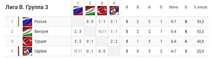 Проиграв матч в Турции, сборная России осталась на первом месте благодаря ничьи в матче Венгрия - Сербия.