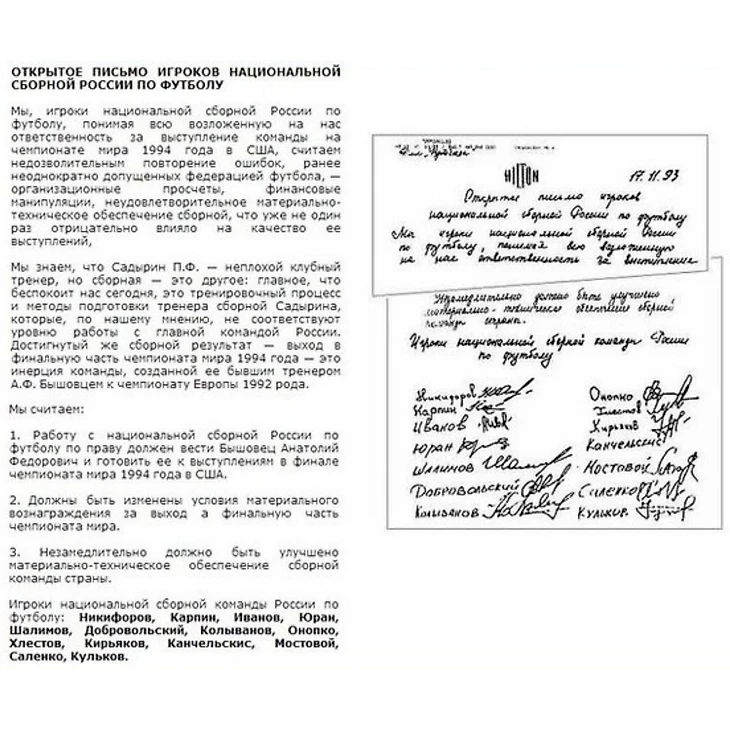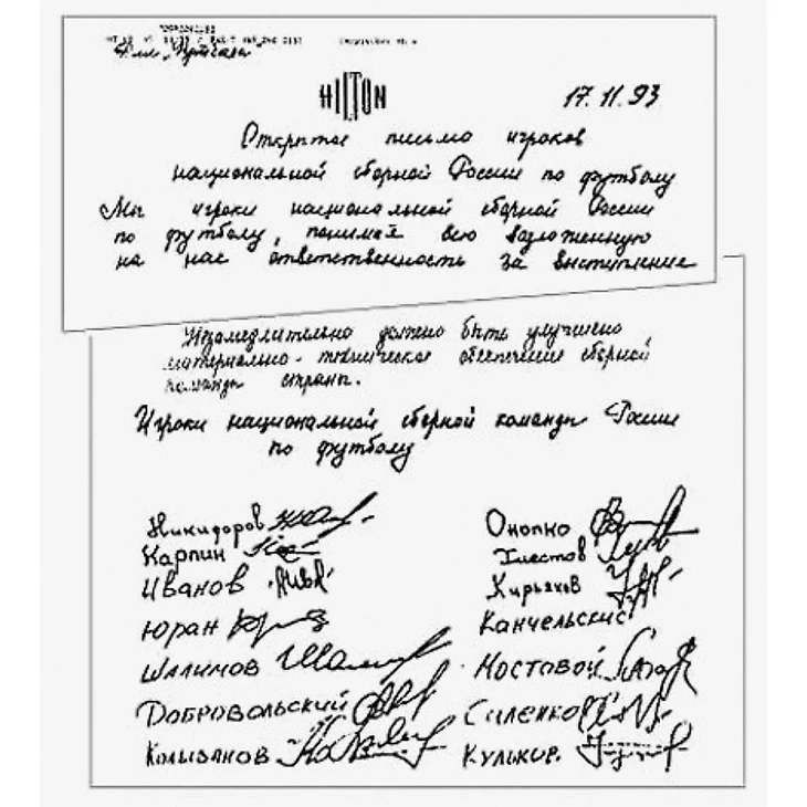 17 ноября 1993 года состоялся один из самых громких скандалов в отечественном спорте, получившим название «Письмо четырнадцати» — открытое письмо игроков сборной России по футболу.
