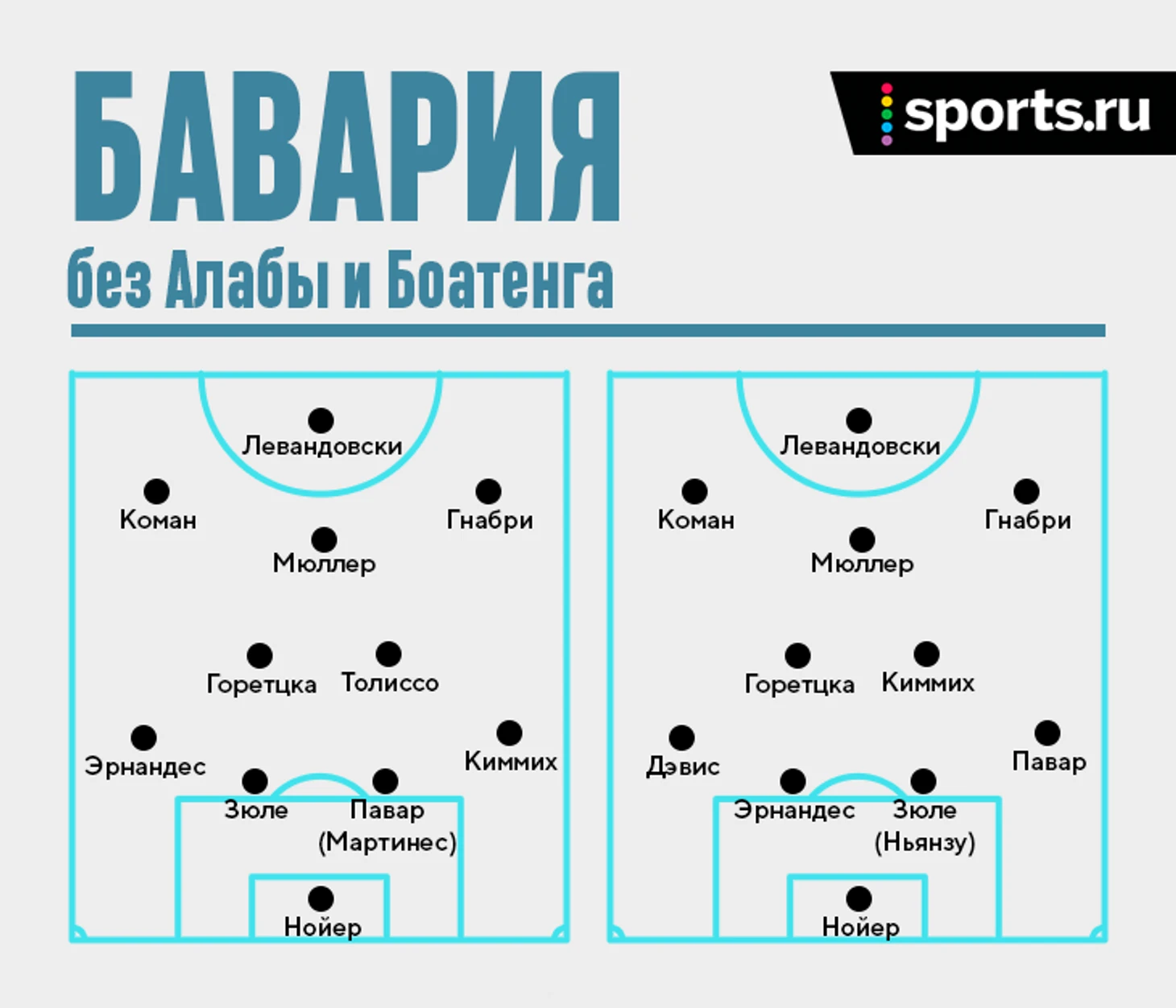 В матче на Суперкубок против «Дортмунда» в конце сентября «Бавария» уже показала, как она будет выглядеть без двух ведущих защитников. Тогда мюнхенцам очевидно не хватало резкого паса из глубины (в чем как раз хороши Боатенг и Алаба), чтобы продвигать атаку. Эрнандес и Зюле при выходе из обороны предпочитали запускать мяч на фланги и к тому же неуверенно играли под давлением дортмундцев.
