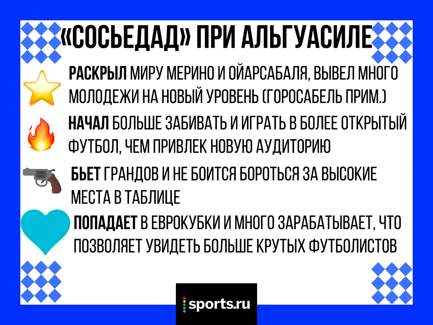 Яркий пример нынешнего «Реала» из Сан-Себастьяна – их главный тренер. Простой, местами слишком, человек. Альгуасиль – воспитанник команды, поиграл за «бело-голубых» девять сезонов. Вот кто, скажите мне, если не этот серьезный мужик, должен олицетворять незыблемые основы своего родного именитого испанского клуба.