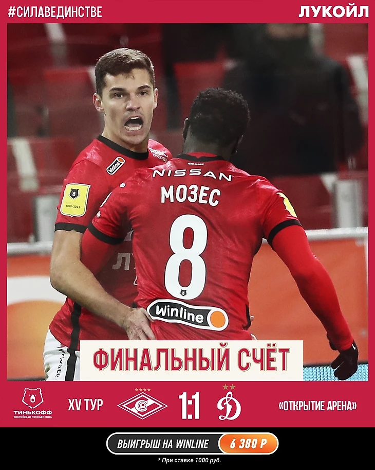 «Спартак» и «Динамо» сыграли вничью в матче 15-го тура РПЛ. Встреча прошла в Москве и завершилась со счетом 1:1.