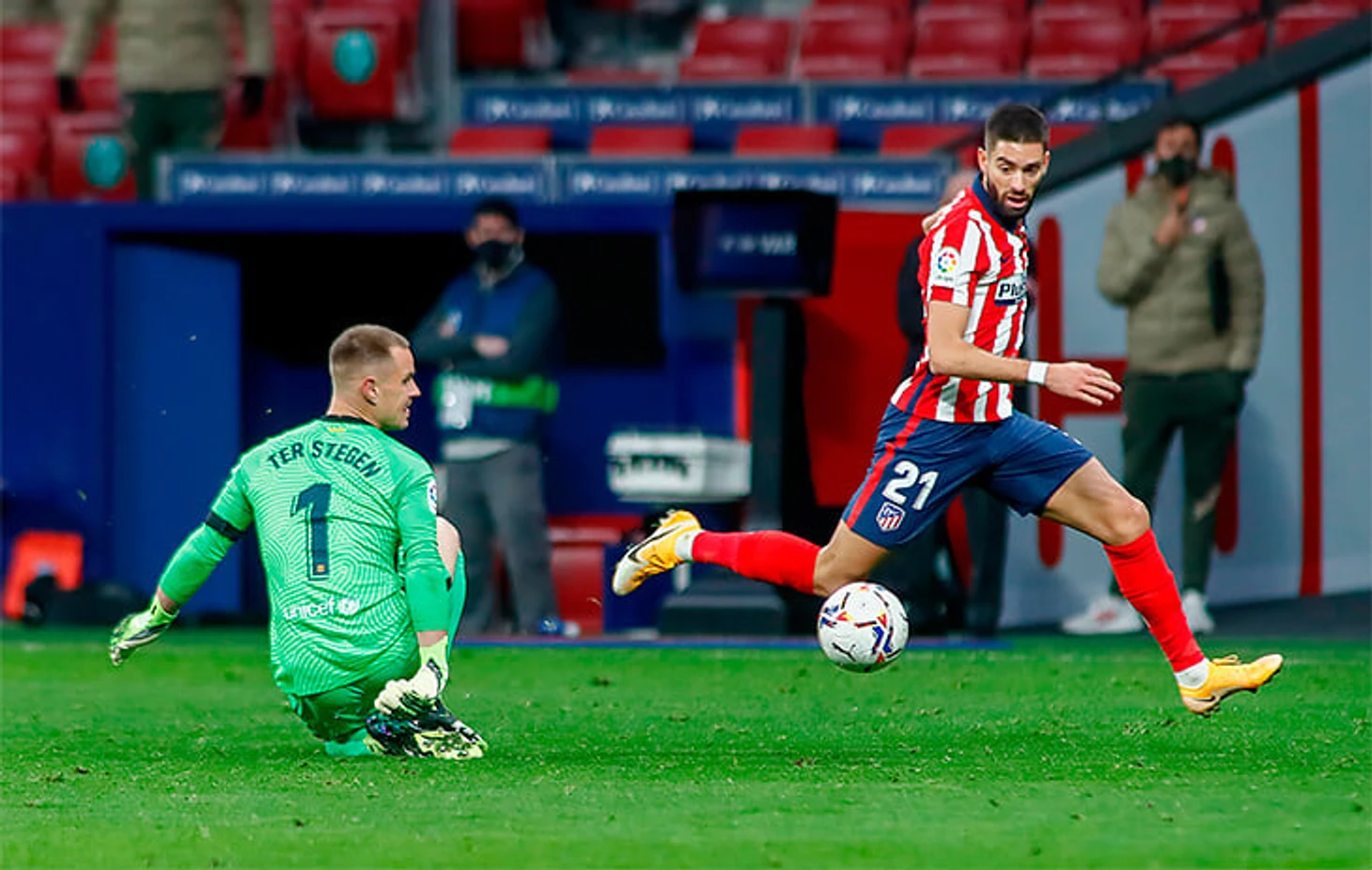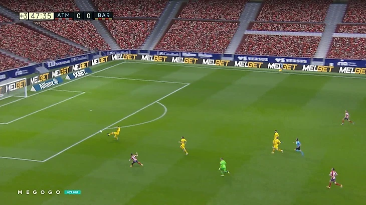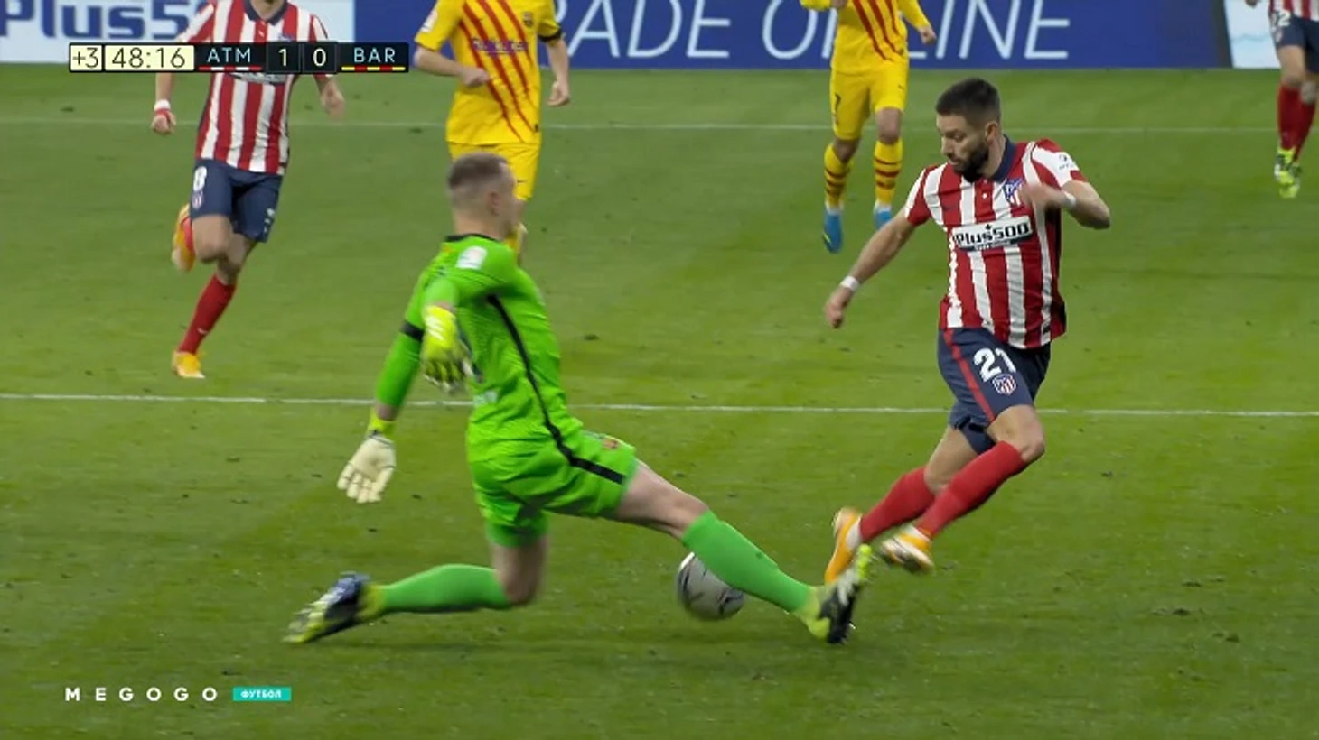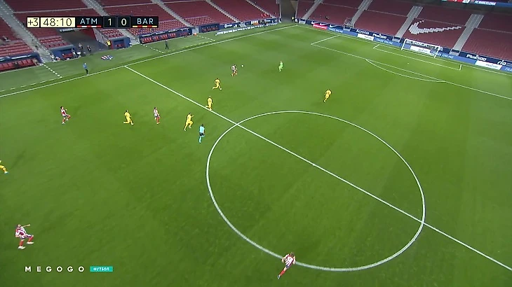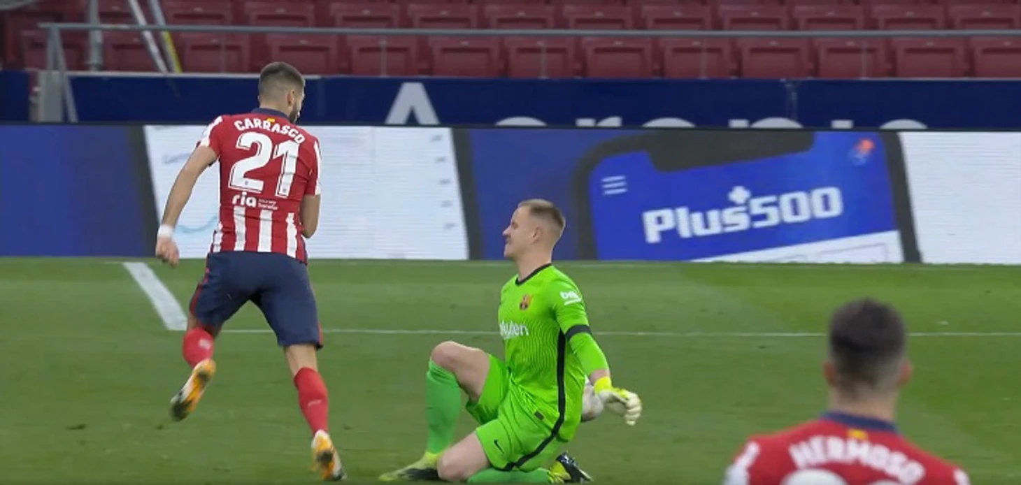 В добавленное к первому тайму время «Барса» потеряла мяч в центре поля, Корреа увидел Карраско и сразу забросил на него. Параллельным курсом к воротам возвращался защитник гостей, но Тер Стеген не поверил в надежность партнеров и выбежал спасать сам.