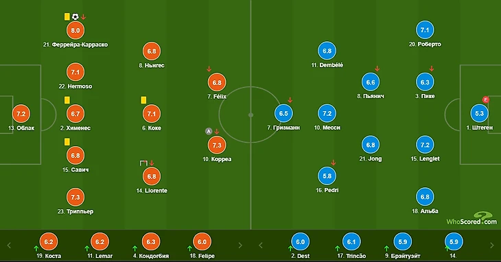 Портал Whoscored опубликовал оценки игроков за этот матч. Лучшими в составе гостей стали Лионель Месси и Клеман Лангле, получившие по 7,2. Помимо них, еще только один игрок смог получить больше семерки - Серджи Роберто (7,1).