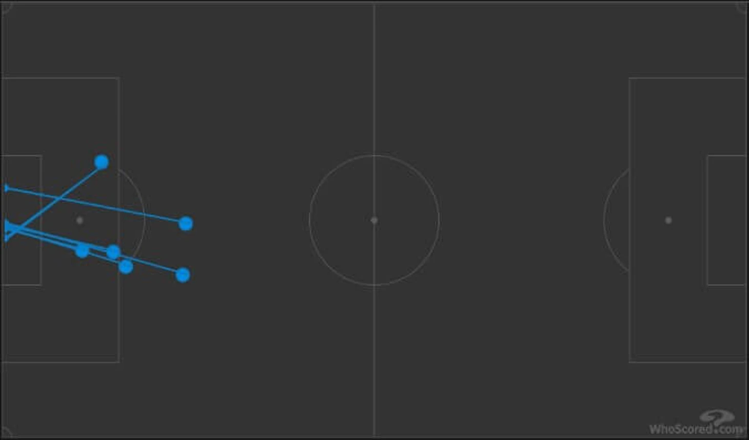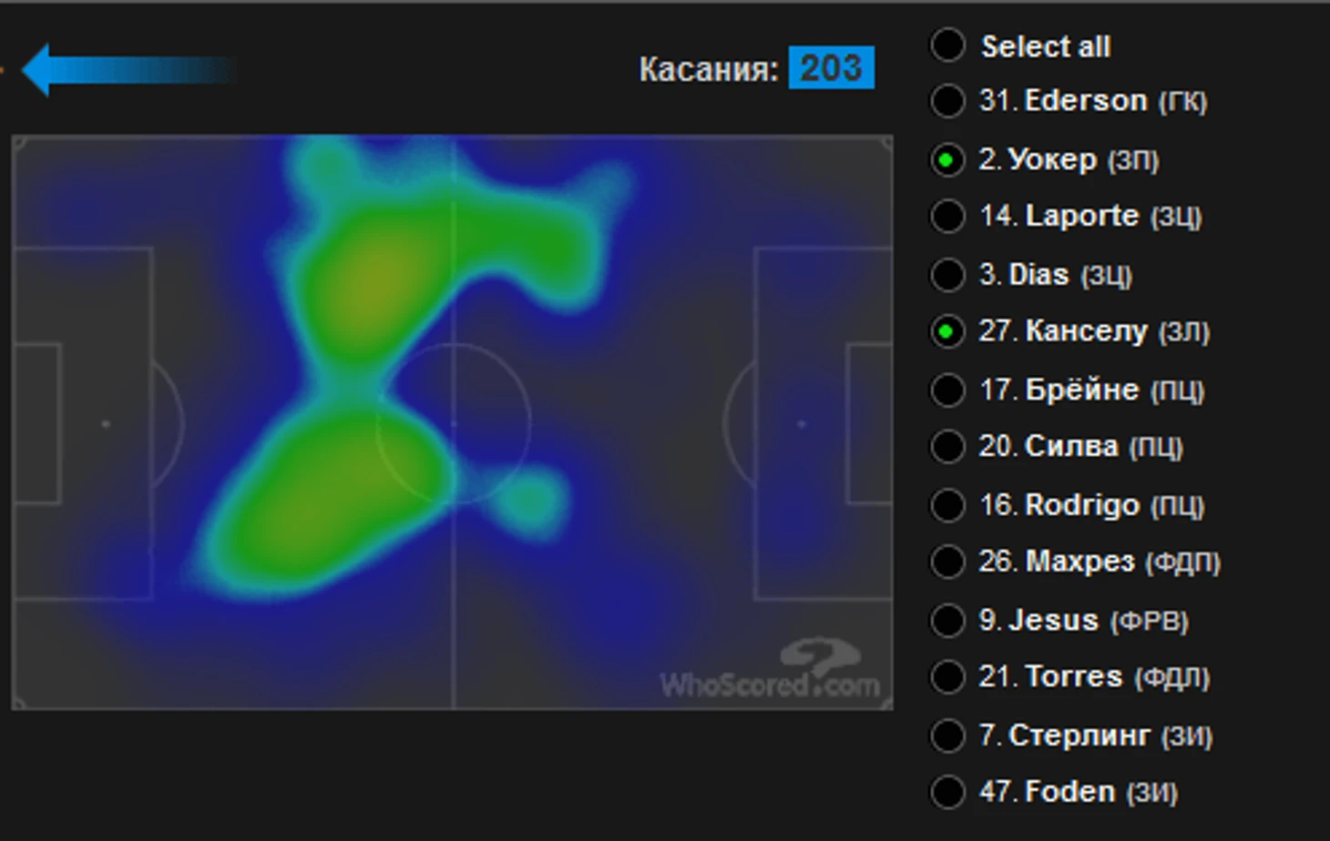 Бернарду сыграл хуже: его включения были бесполезны, он много терял мяч. Становилось интереснее, когда Кевин менялся с ним местами или объединялся – основная опасность приходила с левого края после включений Де Брюйне. Это подтверждает его карта ударов.