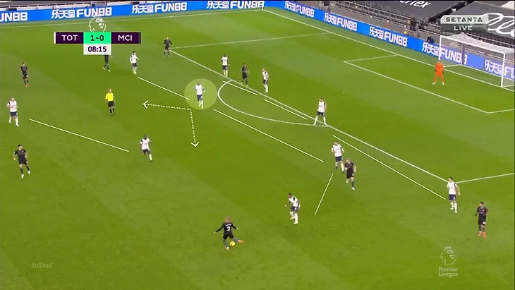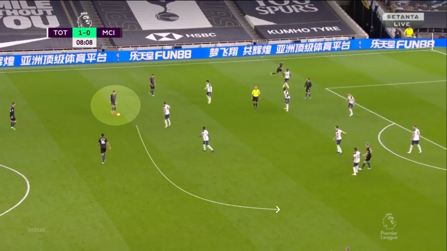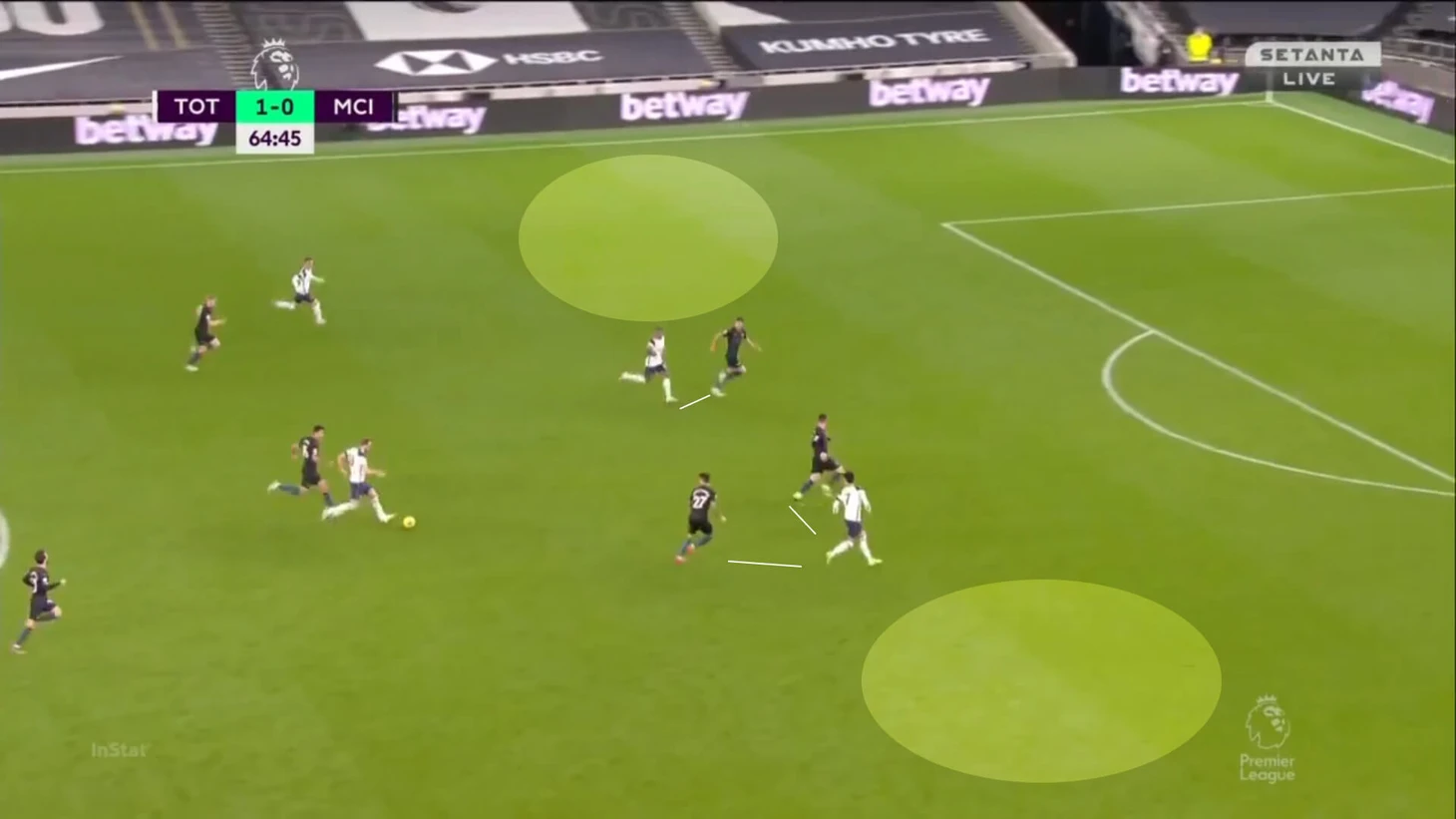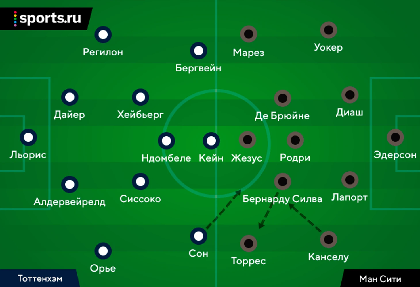 Другая проблема – они играли на флангах в одиночку (Уокер почти не подключался, у Канселу была другая задача). Марез и Торрес оказались оторваны из-за структуры «Тоттенхэма»: центр перекрыт, Бернарду растворился, Де Брюйне плотно держали – никто не мог доставить им мяч в удобную позицию.