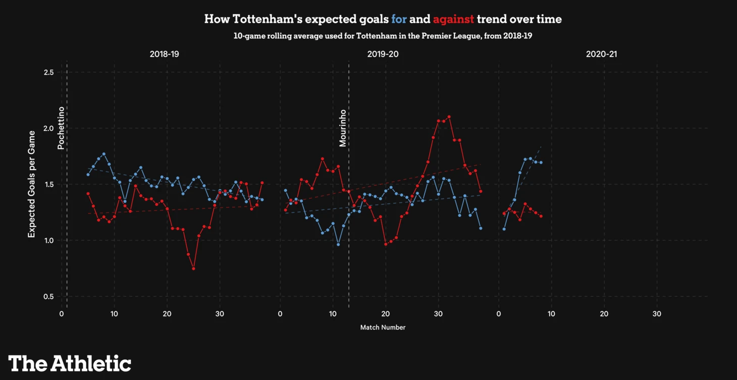 Жозе улучшил игру в обороне – это подтверждает соотношение созданных и допущенных голевых моментов. Синяя линия на графике – созданные шансы, красная – допущенные. Да, Моуринью тоже один раз просел, но это случилось при травмах Кейна и Сона. Теперь «Тоттенхэм» – лидер АПЛ по разнице ожидаемых забитых и пропущенных голов.