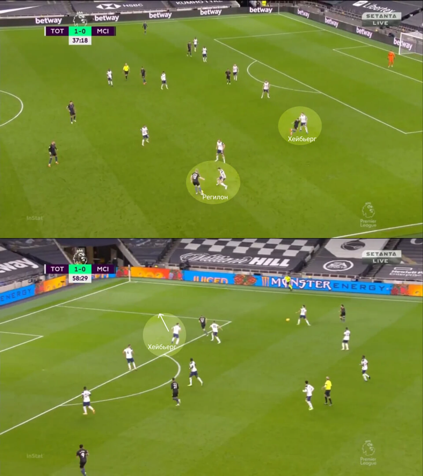 7. Больше 70% атак «Сити» идут через фланги, поэтому Моуринью бросил туда большие силы. Сон и Бергвейн много отрабатывали сзади, чтобы опорники реже покидали центр. Порой механизм был такой же, как у Регилона-Хейбьерга и Орье-Сиссоко.