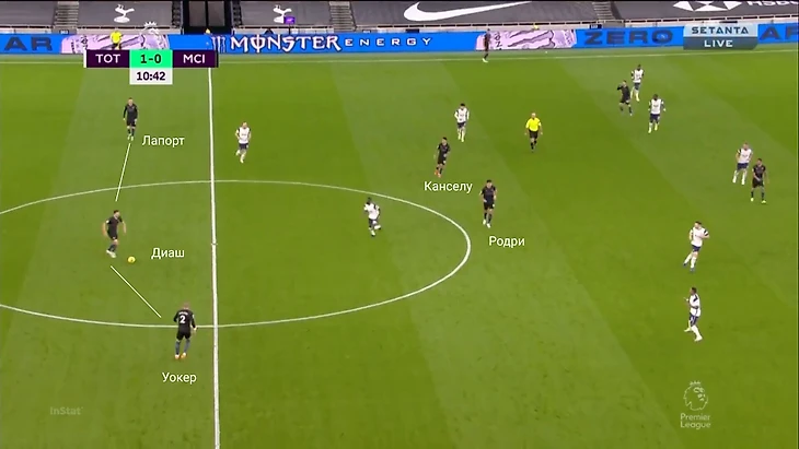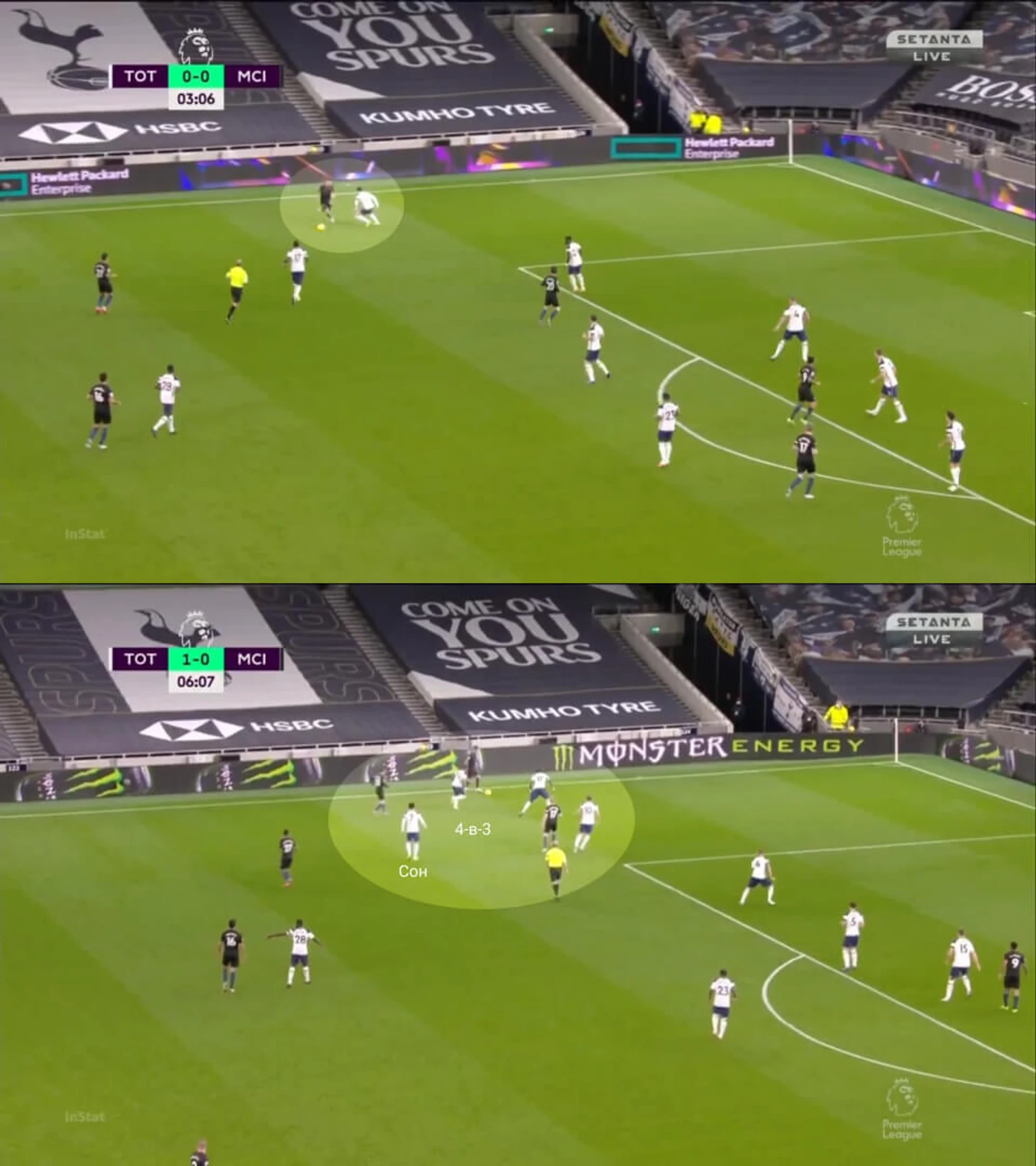 Проблема в том, что португалец несколько раз ошибся. В эпизоде с голом как раз заметна одна из таких ошибок: Лапорт забрал Кейна, Канселу не приблизился к Сону. Диаш делал искусственный офсайд, но задумка не сработала из-за глубокой позиции Жоау: он не только не сделал шаг вперед, но и пропустил включение корейца.