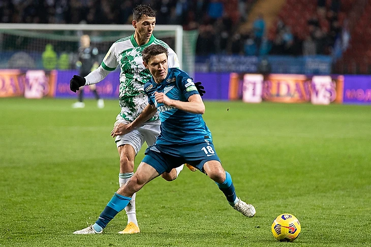 Помимо перемещений Барриоса важную роль играли действия восьмёрок. Дуглас Сантос в левом полуфланге привычно эффективно двигал мяч на рывках и отлично пасовал между линиями (его игра в центре поля нисколько не теряет в качестве по сравнению с выступлением слева в защите - это один из самых эффективных трансферов «Зенита» за последние годы). Правее же Кузяев много помогал развивать атаки в средней трети и часто опускался на фланг. Сутормин, Дзюба и Ерохин впереди играли узко и старались открываться в зоне перед штрафной. Гол Кузяева показал, что у «Зенита» были идеи по преодолению оборонительного блока «Ахмата». Во время давления в центре поля на Ракицкого выбросился Полярус - он в то же время перекрывал направление передачи за спину на Жиркова. Но Ярослав отдал в центр Сантосу, и бразилец уже перевёл мяч на Юрия, тот протащил его по флангу и после взаимодействия перед штрафной Дуглас оказался один на пространстве. На него вынужден был выброситься Тимофеев, а ему за спину забежал Кузяев и классно исполнил.