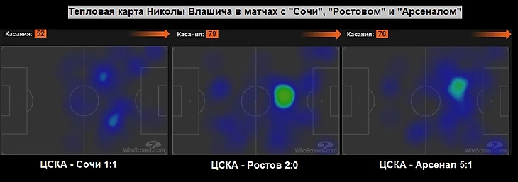 Почему ЦСКА сыграл так слабо? Одна из главных причин - "Сочи" закрыл Влашича. В последних 3 матчах в РПЛ до перерыва на сборные Никола касался мяча не менее 75 раз за игру. Вчера сочинцы дали ему совершить лишь 52 касания. Тепловая карта игры хорвата показывает, что ему не давали выходить на ударные позиции перед штрафной. Южане не пускали туда и других армейцев, тем самым лишив команду Ганчаренко дальних ударов, которыми она если не забивает, то создаёт высокое напряжение у ворот соперника.