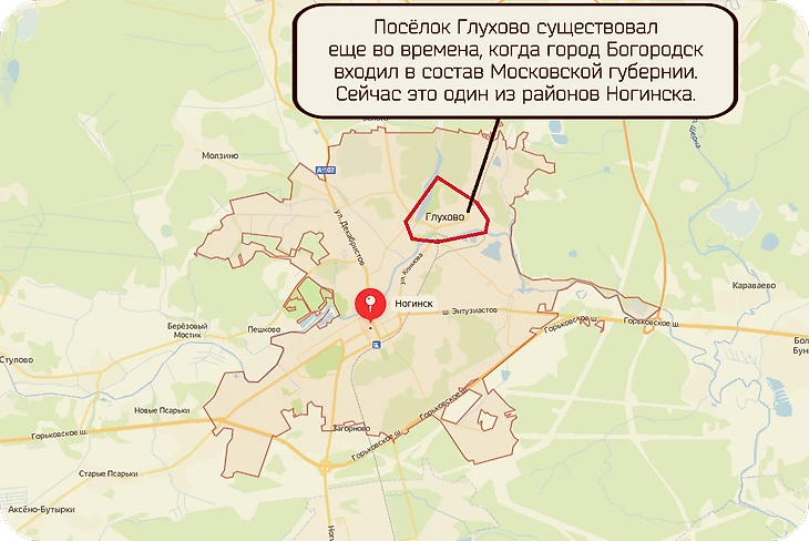 В середине 19 века эти земли (с центром в селе Глухово) приобрел в собственность известный богатый промышленник Захар Саввич Морозов. В 1847 году Морозовы основали здесь Глуховскую мануфактуру – крупнейшее предприятие текстильной отрасли нашей страны в 19 веке. Богородско-Глуховская мануфактура, которой владел Арсений Морозов, в начале ХХ века даже считалась одной из крупнейших и наилучшим образом оснащенных фабрик в Европе. Именно поэтому сюда приезжали и работали иностранные специалисты, главным образом англичане, ибо Англия в XX веке была крупнейшим в Европе текстильным центром.