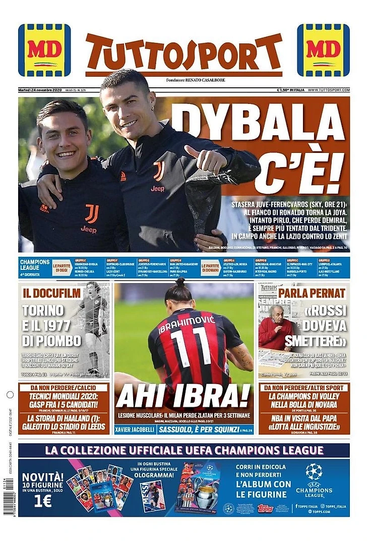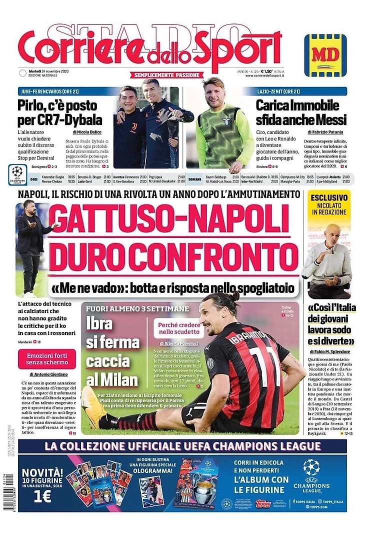 Возвращение Дибалы в состав «Юве» на матч Лиги Чемпионов с «Ференцварошем», игра «Лацио» с «Зенитом», конфликт Гаттузо с игроками после матча с «Миланом», а также травма Ибрагимовича – в утреннем обзоре заголовков итальянских спортивных изданий в блоге «В гостях у Кальчо».