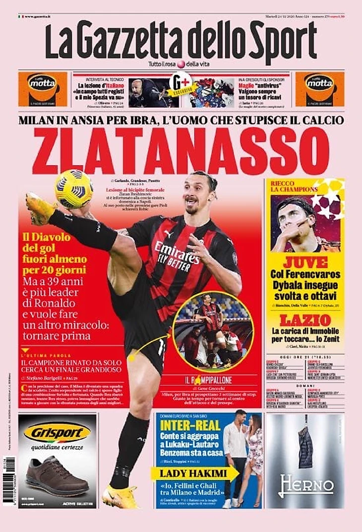«Милан» в опасении за Ибру, человека, который поражает футбол. Дьявол голов выбыл по меньшей мере на 20 дней. Но в 39 лет он больший лидер, чем Роналду и хочет сотворить ещё одно чудо: вернуться раньше.