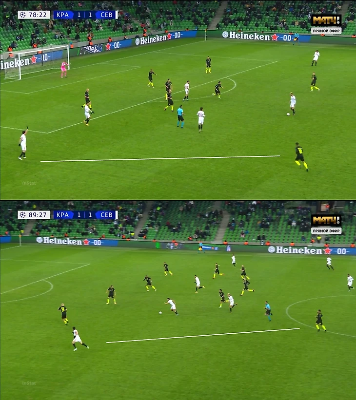 Другая подстройка «Севильи» под «Краснодар» – переход на игру с полноценными вингерами. На правом фланге «Краснодара» творился ад. Рамирес возвращался пешком, поэтому там царствовали Рекик и Идрисси: 11 атак в последние полчаса пришли именно оттуда.