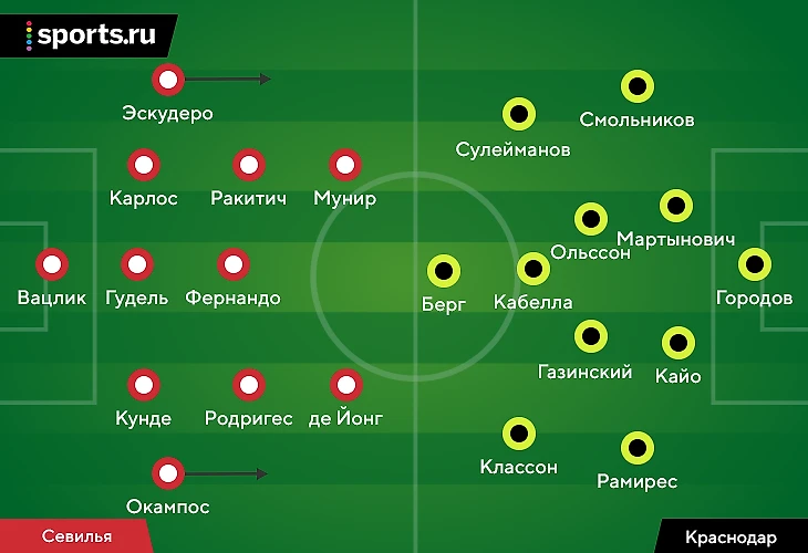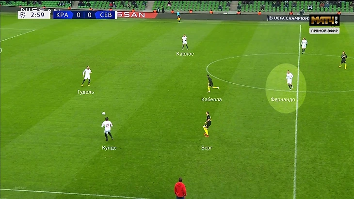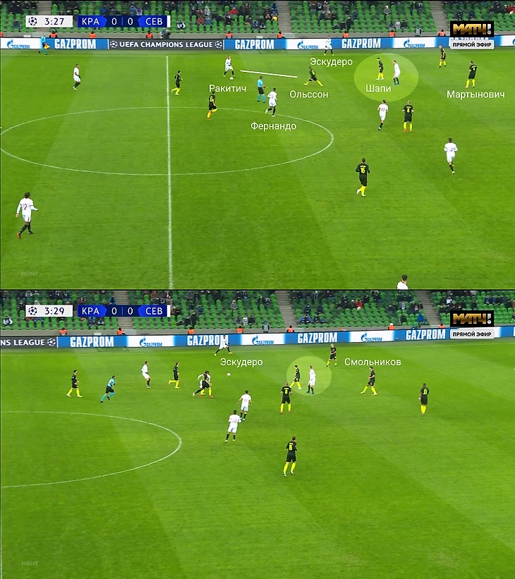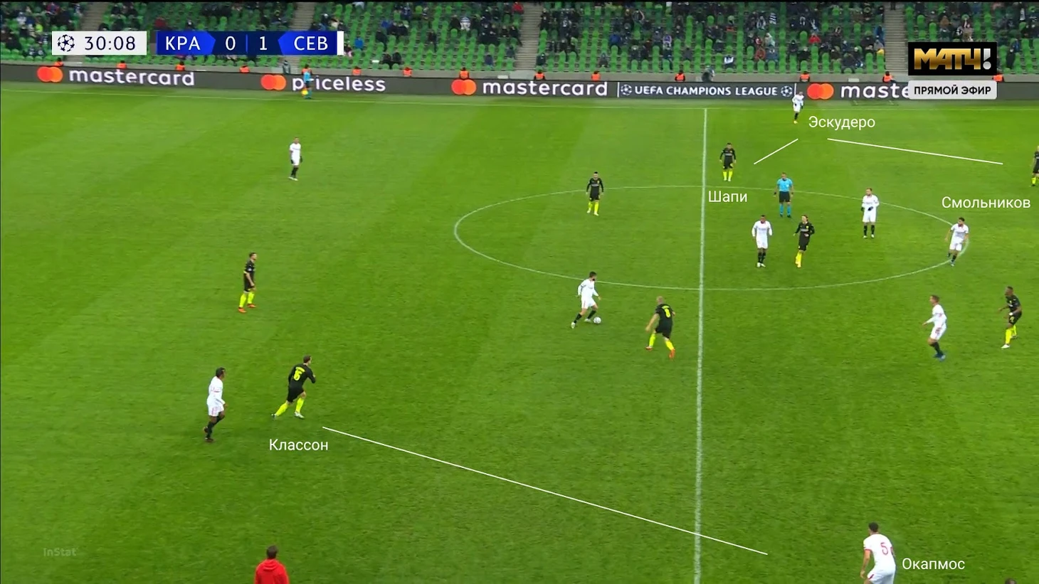 Прессинг теперь выглядел так: Классон, Берг и Вандерсон играли по центральным защитникам, Рамирес и Смольников – по латералям, а Кабелла плотно держал Фернандо. Это моментально дало результат: «Севилья» потеряла контроль над мячом, а «Краснодар» создал два момента, три раза бил по воротам и сделал пять успешных обводок («Севилья» – 0).