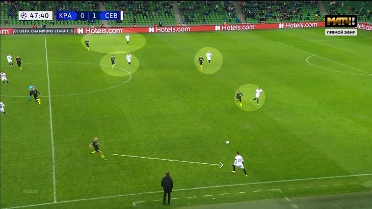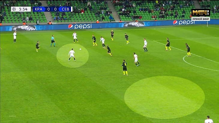 Вторая нерешенная проблема прошлого матча – тогда «Севилья» даже вдесятером создавала численное преимущество в нужных ей зонах. В Краснодаре проблема стала чуть ли не острее.