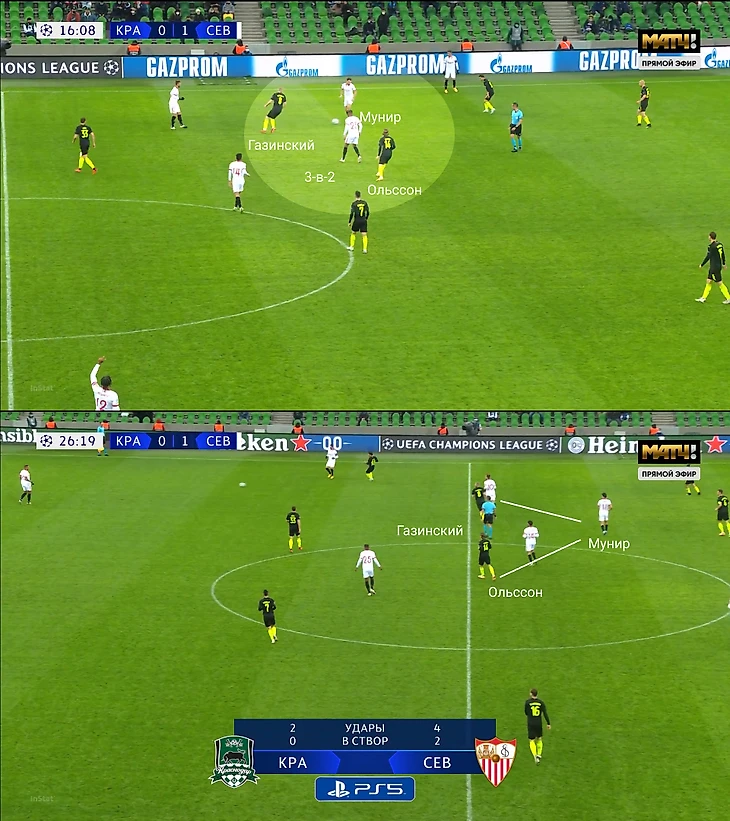 Итого – на каждом этапе «Севилья» владела численным преимуществом. Тройка центральных защитников против пары форвардов, выше – Фернандо, Ракитич и Родригес против Газинского и Ольссона + добивание включениями Мунира. Это вылилось в 60% владения мячом, гол и еще несколько опасных моментов. «Краснодар» первый тайм провалил.