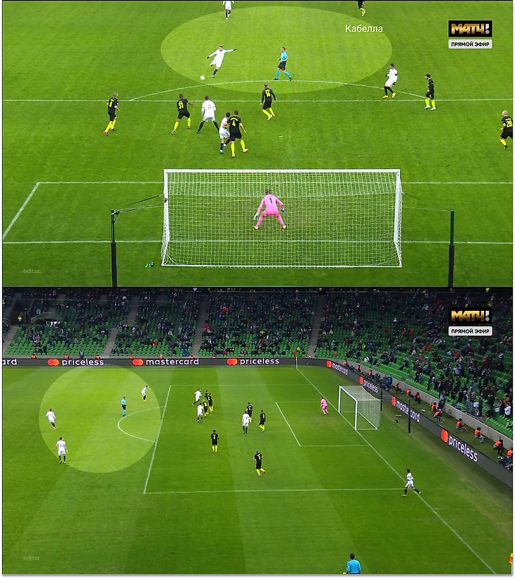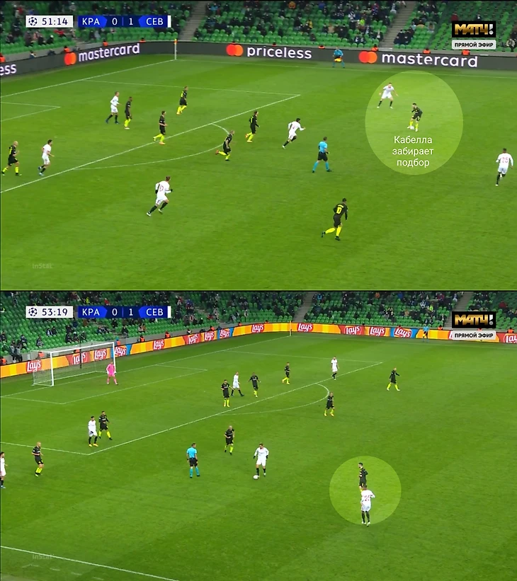 Из-за таких перегрузов возникли вопросы к роли Кабелла. Если в его задачи не входил интенсивный прессинг, зачем он нужен в паре с Бергом? Они никак не препятствовали строительству атак «Севильи», тогда как в центре «Краснодар» невероятно нуждался в дополнительном полузащитнике. Это становилось особенно заметно, когда краснодарцы вжимались в штрафную вшестером – Кабелла где-то блуждал, а зона подбора около штрафной была свободна.