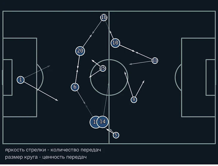 Дальше Эскудеро ошибся, но важно другое: у него было несколько вариантов развития атаки. Можно было обыграть Смольникова 1-в-1, но он остановился, увидев свободную опцию в центре + возможность перевода на Окампоса.
