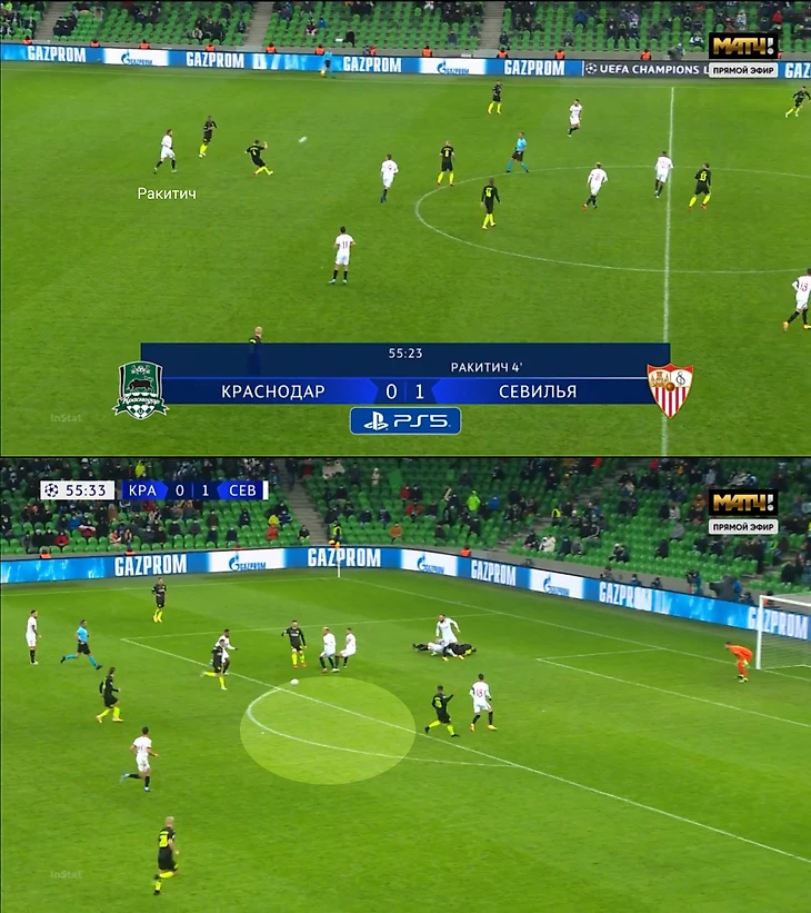 Предголевая атака – идеальный пример непонимания «Краснодара», как обороняться против «Севильи». Хозяева не разобрались в передвижениях гостей, отдали центр поля и оставили фланги свободными.