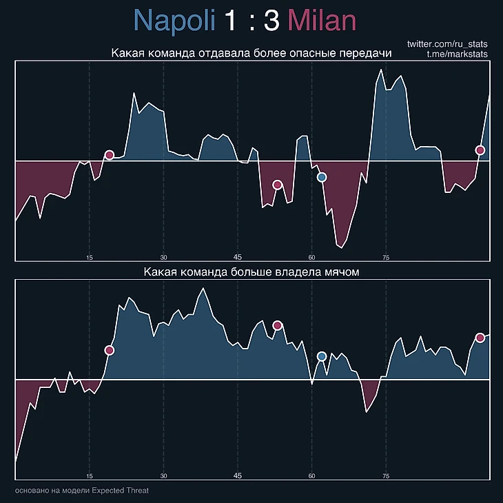 Но не всегда гибкость и желание Пиоли подстроиться под изменившиеся обстоятельства идёт во благо: после первого гола Ибрагимовича «Милан» стал меньше прессинговать, отдал мяч, во второй половине первого тайма процент "Наполи" вырос с 55% до 76%, хозяева стали лучше продвигаться в опасные зоны — наглядно на графике выше. Всё это логично вылилось и в дикий контраст по ударам: на стартовом отрезке — 5:0 в пользу "Милана", с 25-й минуты и до конца тайма — 11:2 за "Наполи". Понятно, что большая часть из них не была опасной, но объём давления впечатляет. Это лишний раз подчёркивает некоторые детали системы, которую строит Гаттузо: если соперник хорошо прессингует и зажимает команду Рино на своей половине поля, могут начаться серьёзные проблемы. Если в силу разных причин — соперник добровольно, как здесь, отказывается от давления, либо же Гаттузо находит способ шокировать оппонента, как против "Аталанты" — "Наполи" не сталкивается с прессингом, то всё идёт куда лучше.