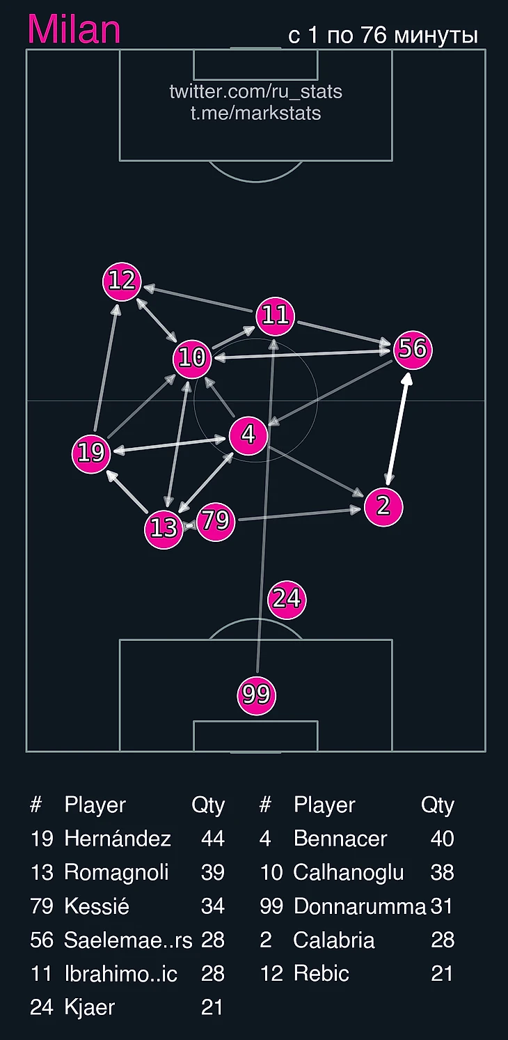 Что касается «Милана», то здесь среди опорников (их тоже двое) более подробно остановимся на Беннасере — карта выше достаточно наглядно показывает его роль. Исмаэль отвечает за продвижение мяча — он находится в самом центре структуры, которая ввиду множества треугольников выглядит очень симпатично. Он был традиционно для себя неплох и в двух других аспектах: три попытки пойти в любимый дриблинг, который отличает алжирца от многих других игроков его типа, а также шесть возвратов владения — лучший результат в обеих командах. Добавьте к этому приятный бонус в виде голевой на Хауге, который окончательно решил все вопросы, — получите одного из скрытых героев матча.