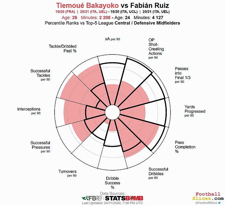 Порой складывается ощущение, что Гаттузо перешёл на double-six в опорной зоне специально под Тьемуэ: когда Бакайоко в "Милане" в рамках формации 4-3-3 выходил на позицию "сидячего" опорника, в определённой степени это автоматически предполагало ряд проблем — он не очень здорово пасует и с этой точки зрения вряд ли может тянуть требования для позиции в тройке. При этом Бакайоко хорош в оборонительной работе, но у него достаточно агрессивный стиль — в этом матче совершил три фола. В итоге он доигрался до удаления, но одна из пограничных ситуаций (до нарушения тоже было очень близко) закончилась возвратом владения на трети "Милана" и голом Мертенса.