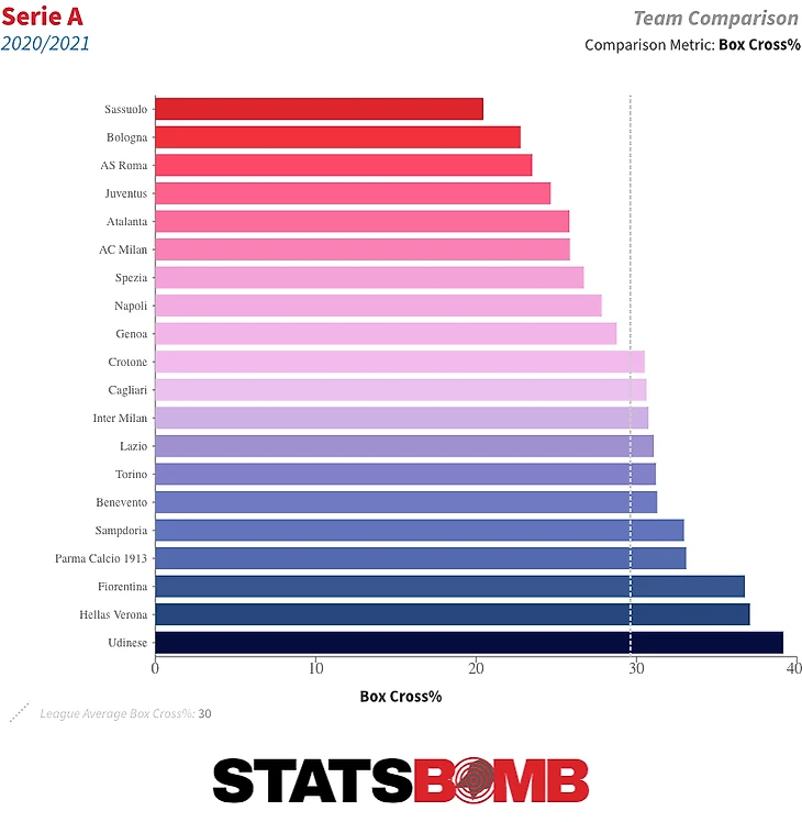 По дистанции всего сезона "Милан" — одна из самых мало навешивающих относительно общего числа передач в штрафную команд с показателем чуть больше 25%. Это шестое место по лиге. Причем в абсолютных значениях по общему числу кроссов за матч, включая навесы со стандартов, которые высчитывает Whoscored, миланцы демонстрируют обратную картину: очень много навесов, что тоже хорошо — это означает, что доставка мяча в штрафную работает на хорошем уровне. Здесь рисунок лишь немного изменился: три кросса с игры — 27% от общего количества передач в штрафную. Интересно, что Ибрагимович нанёс за игру три удара, два из которых головой (в том числе и гол с передачи Тео Эрнандеса), один — ногой после подачи Ребича.
