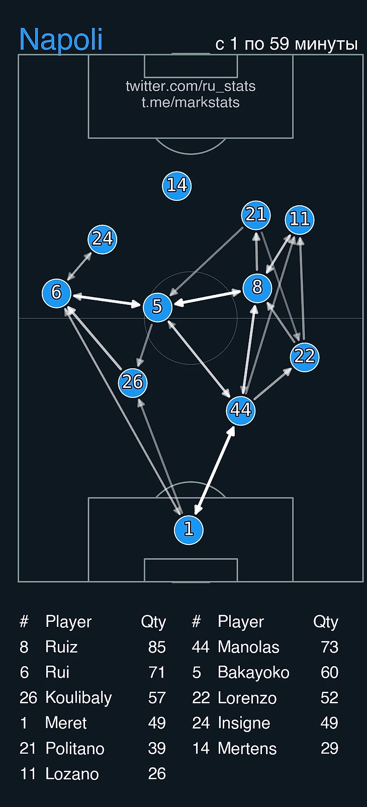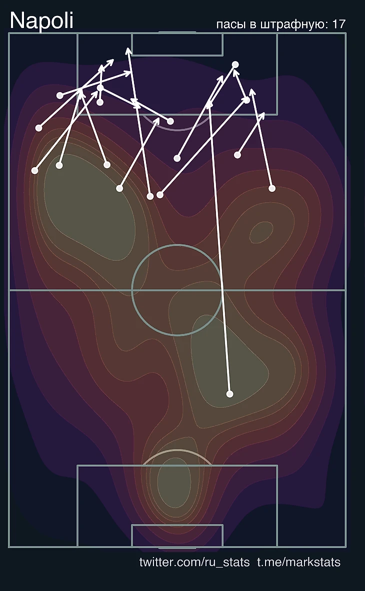 И вот здесь возникает определённое противоречие в сравнении с xT и рисунком игры в целом: как правило, вся острота генерировалась с левой стороны — у Инсинье было пять передач в штрафную с игры, Лоренцо стал лидером по этому показателю среди обеих команд. При этом у капитана неаполитанцев было не так много поддержки от полузащитников — в основном мяч до него доставлялся через Руя. Лидер полузащиты "Наполи" по продвижению мяча Руис не имел постоянной связи с Инсинье. Другой, в целом напрягающий относительно позиционной структуры момент, связан с тем, что единственный игрок "Наполи", записавший себе в актив передачу на биг-шанс, — Костас Манолас, а единственный удар, оценённый выше 0,30 xG, пришёл со стандарта. Всего у "Наполи" три биг-шанса, но вряд ли это даёт полную картину, учитывая саму условность такой категории моментов: самый большой весит 0,53 xG, самый маленький — 0,24 xG, причем разрыв может быть и намного больше. К тому же стоит учитывать глобальные проблемы с метриками компании Opta, которые преследуют их по этому сезону.
