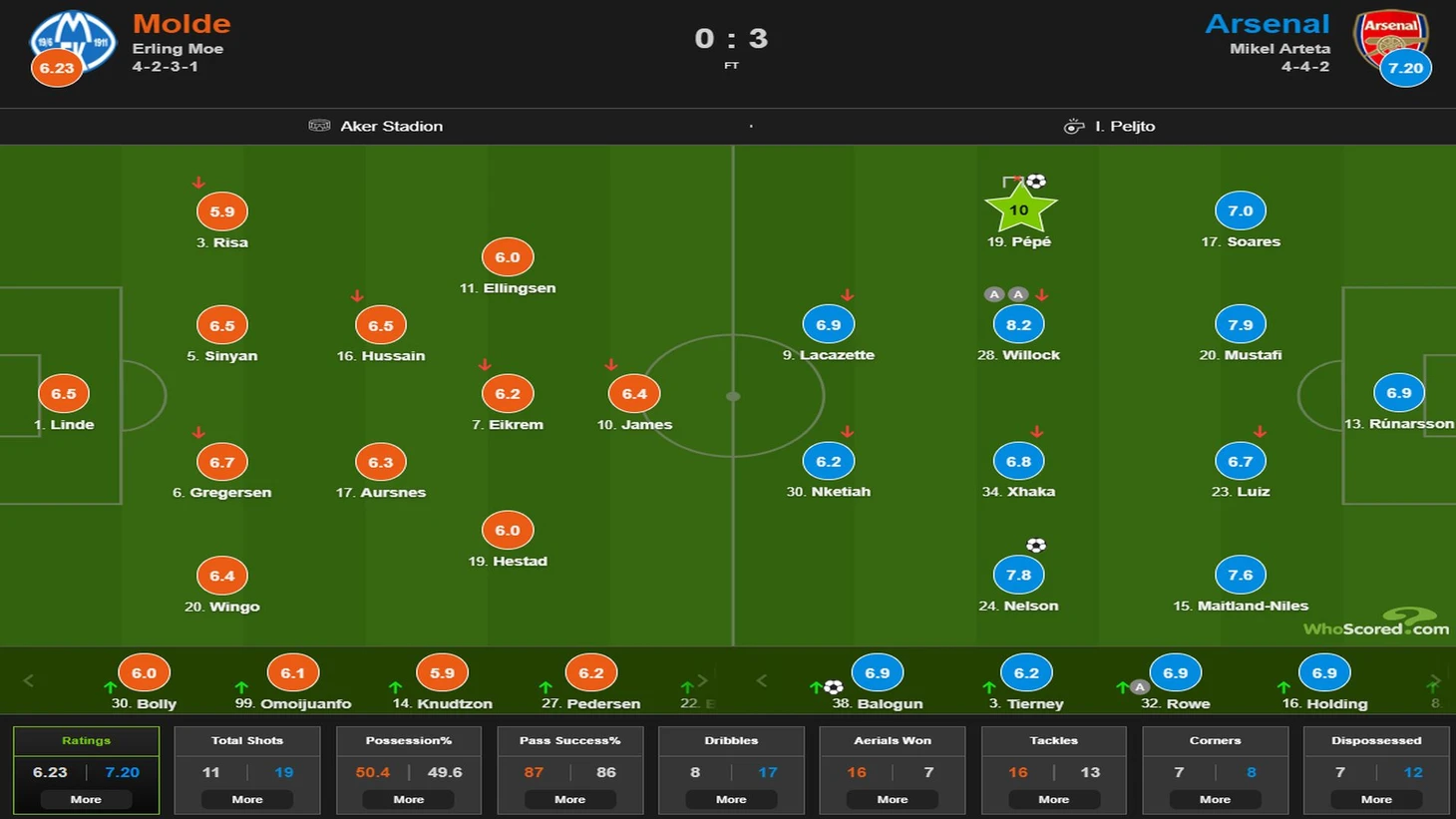 Лучшие игроки Арсенала по оценкам Whoscored.com в текущем сезоне.
