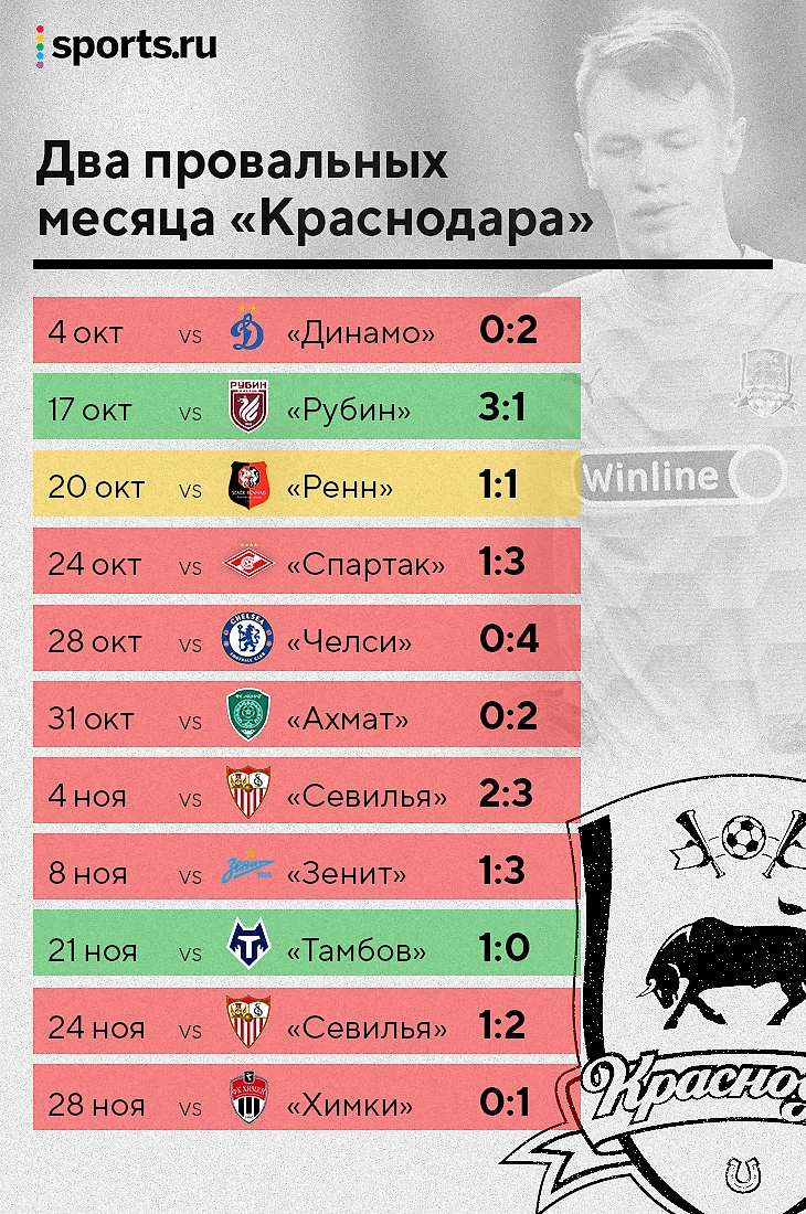 В октябре и ноябре у «Краснодара» только две победы в 12 матчах. А после дебюта на групповом этапе – семь поражений в восьми играх.