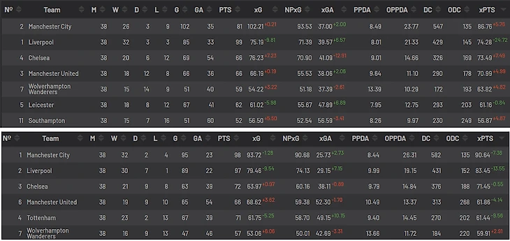 Команда Клоппа совсем не дружит со статистикой – ни с обычной, ни с продвинутой. В своем чемпионском сезоне они перебрали 25 очков по xPTS, хотя принято считать, что сезон они выиграли с большим запасом. Ливерпуль не неуязвим – он плохо играл во множестве матчей, но в большинстве случаев всегда соскакивал и увозил три очка. То угловой на 95-ой минуте, то фол Олбрайтона на пенальти в этом же временном промежутке, то помутнение рассудка у защитников и вратаря соперника, то плохой день у атаки противоположной команды.
