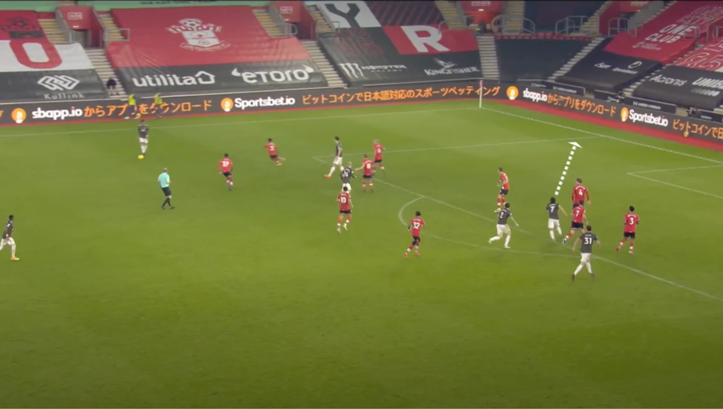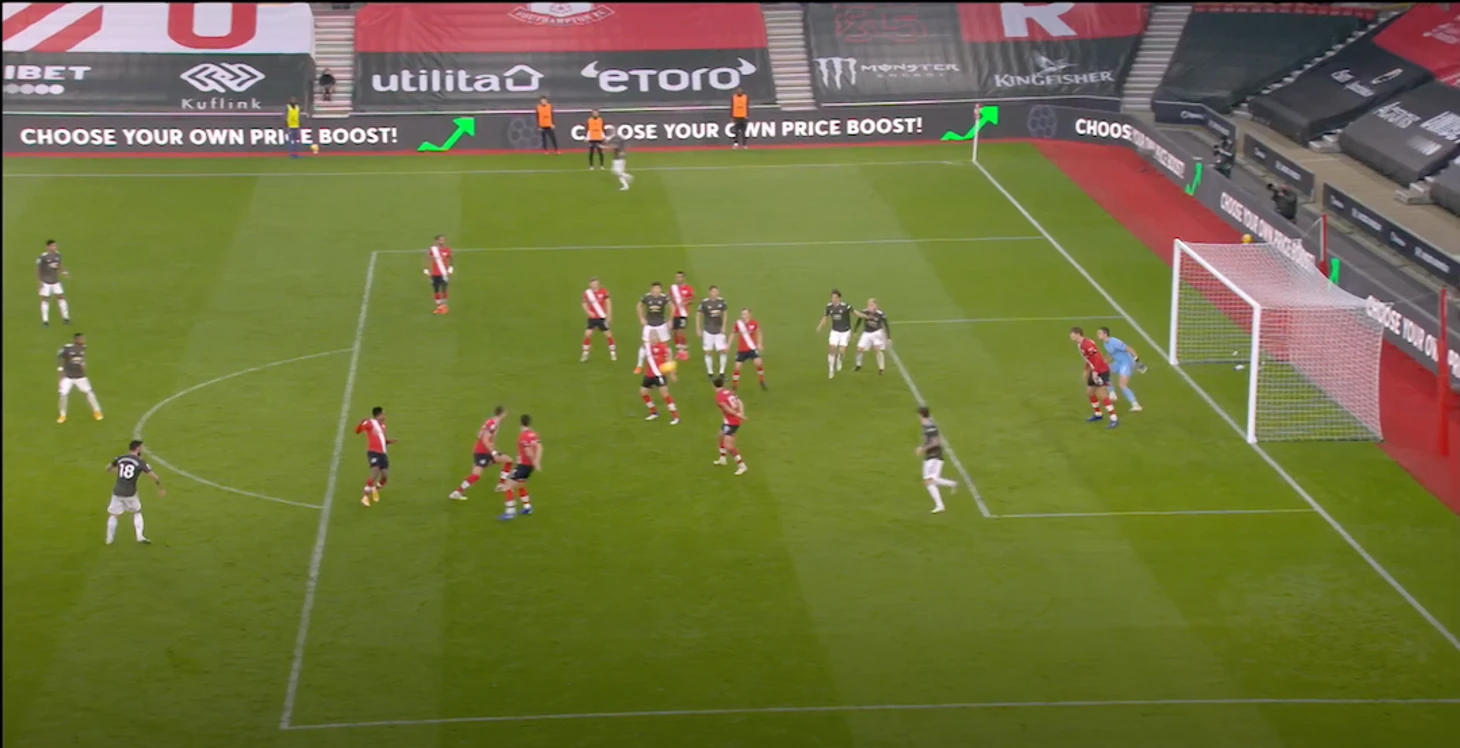 Бруну Фернандес разыгрывает штрафной удар в 40 метрах от ворот Маккарти. Почти все игроки на поле находятся в штрафной "святых" и ждут подачи от португальца. Но он немного неожиданно решает разыграть мяч и отдаёт пас на левый фланг, где в одиночестве находится Маркус Рашфорд.